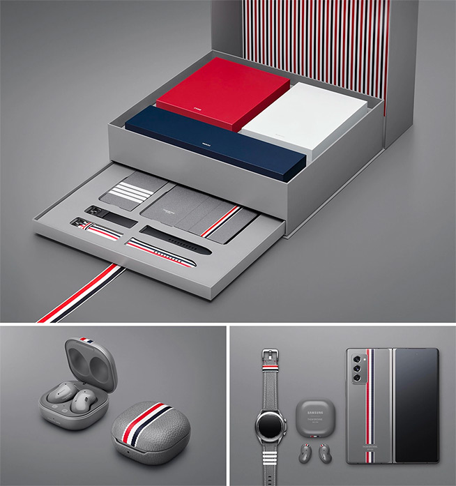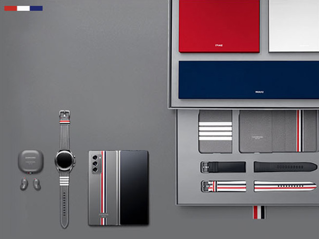 借鑒了Thom Browne標(biāo)志性的標(biāo)志性西裝色調(diào)和品牌設(shè)計(jì)風(fēng)格,Galaxy Z Fold2 Thom Browne限量版外殼、配件以及包裝設(shè)計(jì)均進(jìn)行了相應(yīng)的調(diào)整,最終呈現(xiàn)在大家面前的是風(fēng)格頗為一致的“多件套”,套裝中的Galaxy Watch3以及Galaxy Buds Live同樣如此。