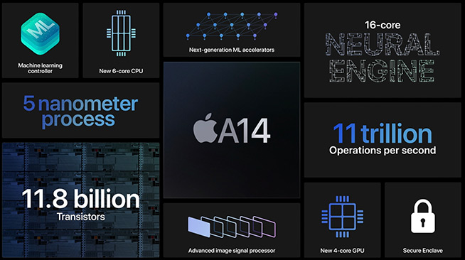 得益于工藝制程的優(yōu)勢,蘋果A14芯片實現(xiàn)了多達118億個晶體管的集成,相比A13增加了近40%。芯片中包含了6核CPU,兩個大核+四個效能核心的組合,蘋果稱其CPU性能相比上一代提升多達40%。GPU采用了新的架構(gòu),比上一代芯片提升30%性能,而AI神經(jīng)單元引擎的內(nèi)核數(shù)量提升1倍,達到16核設(shè)計,11萬億次運算的速度提升10倍之多。