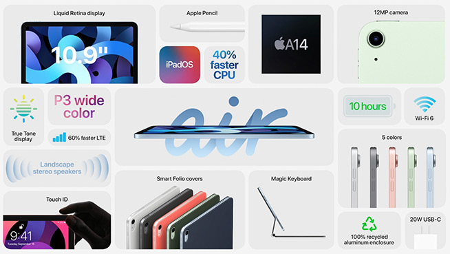 新款iPad Air配備10.9英寸全面屏,采用全新的電源與Touch ID整合式設(shè)計,支持Apple Pencil2和妙控鍵盤,改用USB-C接口并標配20W USB-C電源適配器和USB-C充電線,10月開始發(fā)售。
