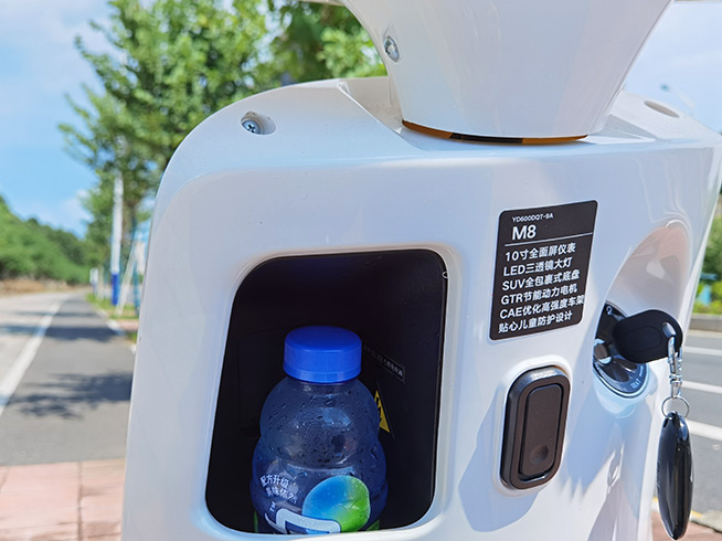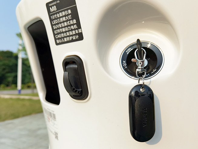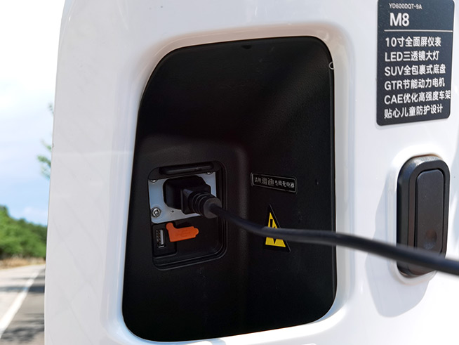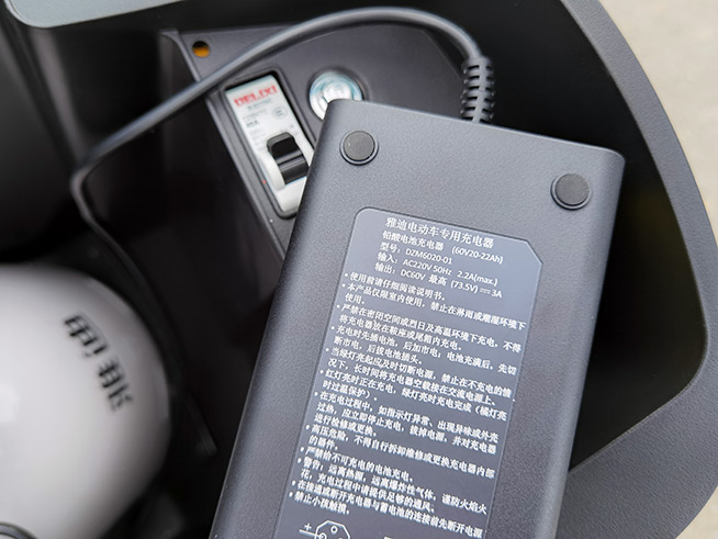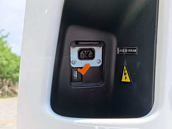 基于安全用電的考慮,雅迪冠能M8的充電接口設(shè)計(jì)在前置物斗的上方,并設(shè)有塑料滑蓋保護(hù),在充電口旁邊還自帶USB-A輸出接口,方便給手機(jī)等設(shè)備臨時(shí)充電。