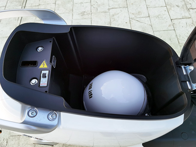 座墊下方是一個(gè)容量約25L的超大座桶,實(shí)測(cè)能夠輕松放入雙肩包外加騎車(chē)頭盔,還有媒體同行測(cè)試放入兩箱飲用水也不成問(wèn)題,可見(jiàn)雅迪冠能M8儲(chǔ)物空間應(yīng)對(duì)大多數(shù)日常通勤需求是夠用的。