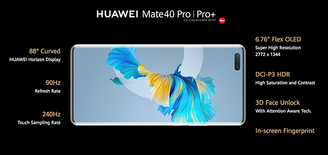 華為Mate 40 Pro和Mate 40 Pro+為雙挖孔屏設(shè)計(jì),前者與Mate 40一樣有兩種材質(zhì)五款顏色,后置有黑白兩款不同的納米微晶陶瓷機(jī)身。兩款機(jī)型均配備6.76英寸88°超曲面環(huán)幕屏(OLED),分辨率2772*1344像素,支持3D面部解鎖。