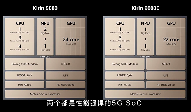 Mate 40 Pro、Mate 40 Pro+、Mate 40 RS保時(shí)捷設(shè)計(jì)均搭載5納米5G SoC麒麟9000,至于麒麟9000E,CPU一致,NPU少了一個(gè)大核,GPU為22核。