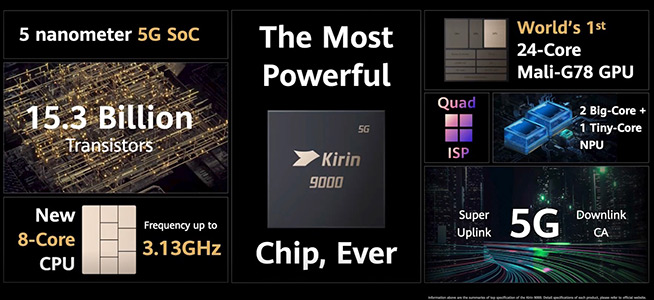 麒麟90000 5G SoC芯片集成了多達(dá)153億個(gè)晶體管,數(shù)量是蘋果A14的130%,全新8核CPU為1+3+4架構(gòu),大核A77主頻可高達(dá)3.13GHz,24核GPU Mali-G78,比高通驍龍865+快52%,1+2架構(gòu)設(shè)計(jì)的NPU跑分比驍龍865+快2.4倍。憑借第三代巴龍5G調(diào)制解調(diào)器的加持,5G上行峰值可達(dá)競(jìng)品的5倍,下行峰值也達(dá)到2倍。