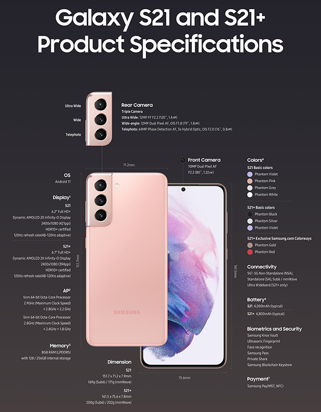 此次推出的三星Galaxy S21系列包括三款機型,包括S21、S21+、S21 Ultra,定位依次提升,全系使用性能更強的5納米SoC芯片。S21和S21+均采用了后置三攝,由1200萬主攝+1200萬超廣角+6400萬長焦(裁切)組成,前置相機1000萬像素。按照三星中國官網(wǎng)的數(shù)據(jù),S21屏幕6.2英寸,電池4000mAh,重量171g,S21+屏幕6.7英寸,電池4800mAh,重量202g。