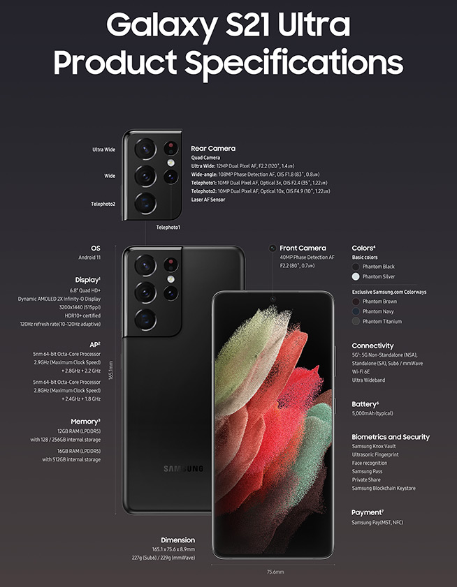 S21 Ultra搭載后置四攝,其中主攝達到1.08億像素,超廣角1200萬像素,長焦與10倍光變潛望式長焦均為1000萬像素。S21 Ultra電池提升至5000mAh,而該機重量達到229g,接近“重半斤”。S21 Ultra配備12GB或者16GB內(nèi)存,最高擁有512GB存儲空間,以配件形式支持S Pen,售價1199美元,約合人民幣7764元。