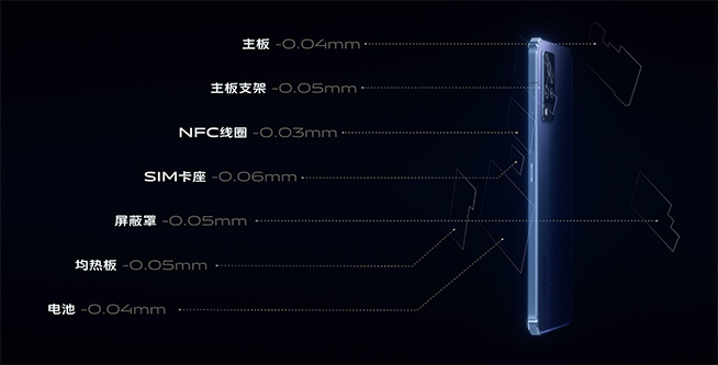 超薄的外觀設(shè)計是vivo S7廣受年輕人青睞的優(yōu)勢之一,vivo S9繼續(xù)為他們帶來驚喜。在經(jīng)過vivo最薄主板、vivo最薄主板支架、vivo最薄SIM卡座、vivo最薄屏蔽罩、vivo最薄均熱板、vivo最小外形光電指紋、vivo最高電芯體系的七項構(gòu)架突破,以及對NFC線圈厚度的壓縮,vivo S9在硬件配置全方位升級的情況下仍刷新了vivo最薄5G手機(jī)的紀(jì)錄,子夜藍(lán)配色機(jī)身厚度僅為7.35mm,重量僅有173g。配合全新的直邊式金屬中框設(shè)計和中框兩側(cè)鉆石切割工藝所帶來的明暗光線變化,整機(jī)視覺也更顯纖薄。