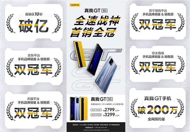 3月10日,realme真我GT正式開(kāi)售,根據(jù)realme官方公布的數(shù)據(jù),其首銷(xiāo)10秒即突破億元銷(xiāo)售額,刷新realme旗艦機(jī)首銷(xiāo)日銷(xiāo)量歷史新高的同時(shí),還在天貓、京東、蘇寧易購(gòu)、歡太商城四大電商平臺(tái)獲得手機(jī)品牌銷(xiāo)量與銷(xiāo)售額雙冠軍,坐實(shí)realme真我GT的爆品頭銜,獲得年輕消費(fèi)者廣泛認(rèn)可,喜迎開(kāi)門(mén)紅。