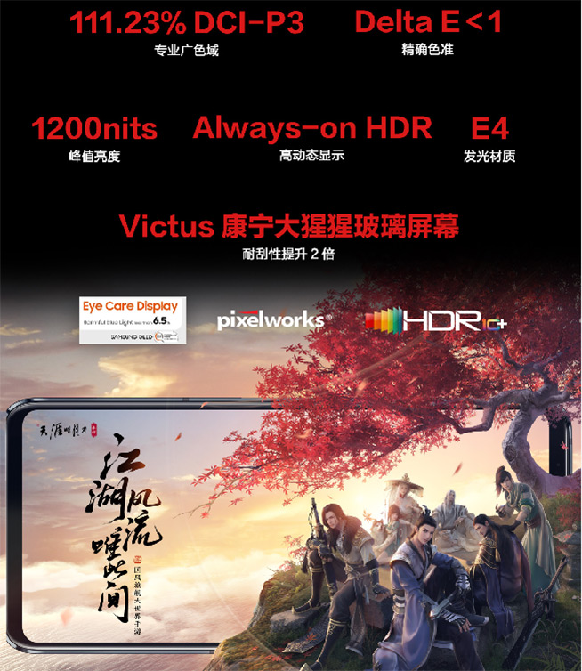 騰訊ROG游戲手機(jī)5通過了HDR10+ 認(rèn)證。采用了pixelworks芯片,色準(zhǔn)Delta E<1,擁有準(zhǔn)確的色彩呈現(xiàn),從而提供出色的視覺體驗(yàn)。并且支持always on HDR,游戲中暗處敵人無處遁形。這塊屏還具有SGS低藍(lán)光認(rèn)證和DC調(diào)光功能,對用戶眼部舒適度也投入了更多關(guān)注。