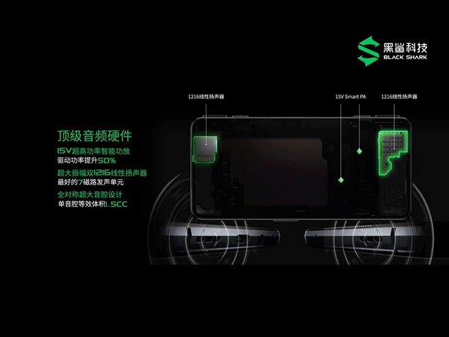 為了打造極致的音頻體驗,黑鯊4 系列采用了側面雙對稱揚聲器+超大音腔設計,這種結構保證了聲場的擴展性,形成極具空間感的立體聲效,讓熱衷“吃雞”手游的玩家更輕松的聽聲辨位,同時雙側布局又很好地規(guī)避了橫握時遮擋的問題。作為榮登DXOMARK音頻第一的黑鯊4 Pro,選用15V 智能功放,將音腔等效體積為1.5cc高靈敏超大振幅線性揚聲器的動態(tài)范圍完美展現(xiàn),讓高品質音頻得到更充分的釋放,給予玩家更強的沉浸感。