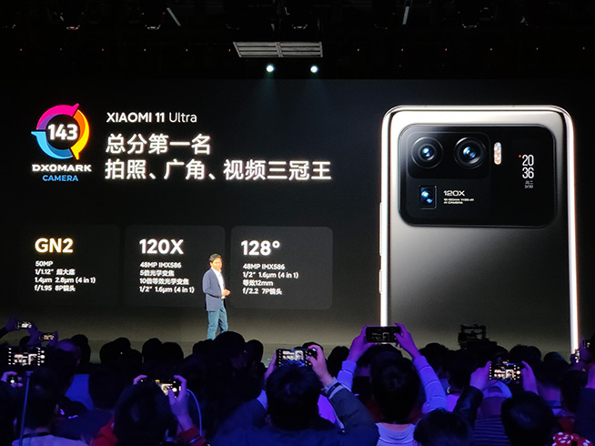 小米11 Ultra主攝同樣為超大底的5000萬(wàn)像素三星GN2,超廣角和潛望式長(zhǎng)焦鏡頭均換成了4800萬(wàn)像素的索尼IMX 586,支持5倍光學(xué)變焦和120倍數(shù)字變焦,可謂是堆料更足,雷軍稱這三枚鏡頭都是主攝級(jí)別,且都支持8K視頻錄制。根據(jù)DxOMark給出的成績(jī),小米11 Ultra以143分的成績(jī)拿到了綜合分第一,并且拍照、廣角、視頻也都是第一名。