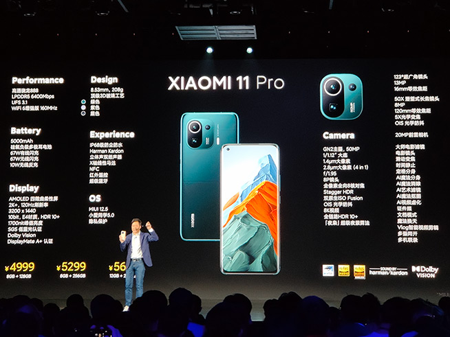 小米11 Pro首先登場(chǎng),這款手機(jī)在小米11的基礎(chǔ)上有多項(xiàng)增強(qiáng),包括四大全球首發(fā)的技術(shù):三星GN2主攝、硅氧負(fù)極多極耳電池、新型相變導(dǎo)熱材料、67W無(wú)線快充。該機(jī)有8GB+128GB、8GB+256GB以及12GB+256GB三個(gè)配置,分別定價(jià)4999元、5299元和5699元。雷軍指出,小米11 Pro是“不用比的”安卓機(jī)皇。