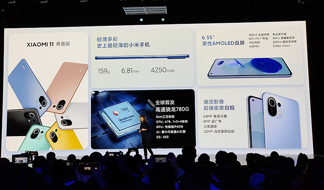 在上半場(chǎng)的發(fā)布會(huì)上,小米11青春版同步亮相,該機(jī)首發(fā)5納米高通驍龍780G移動(dòng)平臺(tái),安兔兔v9跑分約為56.7萬(wàn)。輕至159g,薄至6.81mm,是小米手機(jī)輕薄之最,大概也是最輕薄的安卓手機(jī)之一了吧。難得可貴的是,小米11青春版還塞入了4250mAh電池。