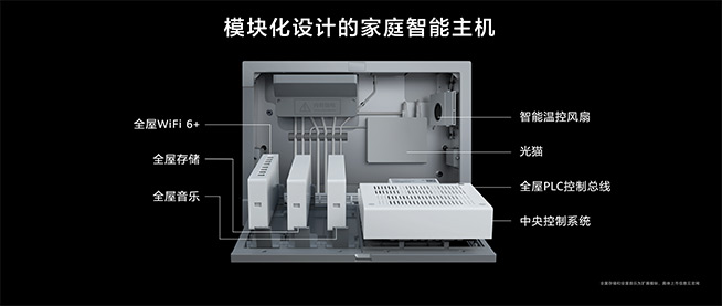 在內(nèi)部構(gòu)造上,華為全屋智能主機(jī)包含中央控制系統(tǒng)、全屋PLC控制總線、全屋Wi-Fi6+、智能溫控風(fēng)扇、光貓以及兩個(gè)擴(kuò)展模塊全屋存儲(chǔ)、全屋音樂。高度模塊化設(shè)計(jì),使其具有高集成,可按需擴(kuò)展,易維護(hù)等優(yōu)點(diǎn)。除了內(nèi)部的高集成,華為全屋智能主機(jī)復(fù)用弱電箱的位置,不單獨(dú)占用空間,相比較傳統(tǒng)家庭機(jī)房,更簡約,強(qiáng)悍,設(shè)計(jì)上采用全鋁合金一體化沖壓無縫成型,簡約美觀,彰顯檔次。