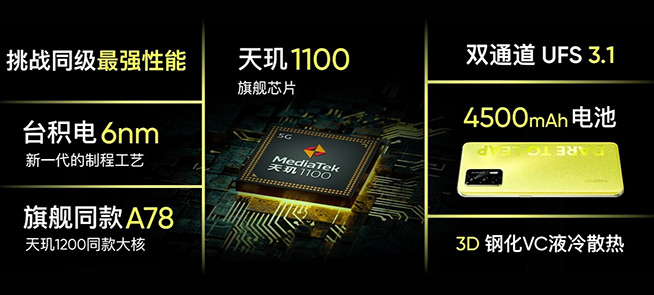 相比上一代真我Q2,真我Q3 Pro憑借天璣1100芯片的升級(jí),實(shí)現(xiàn)了多達(dá)80%的性能提升。臺(tái)積電6納米工藝的天璣1100大核為A78,5G能力則與天璣1200芯片完全一致,雙卡雙5G、雙SA、雙VoNR也安排上了,是“第三代5G手機(jī)”。
