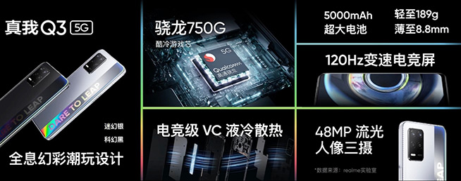 另一款新機(jī)真我Q3則搭載高通驍龍750G芯片,提供迷幻銀和科幻黑兩款配色,內(nèi)部有VC液冷散熱,達(dá)到了同級(jí)別機(jī)型頂級(jí)的散熱表現(xiàn)。真我Q3也是在4月29日開售,6GB+128GB與8GB+128GB版分別定價(jià)1299元和1399元。