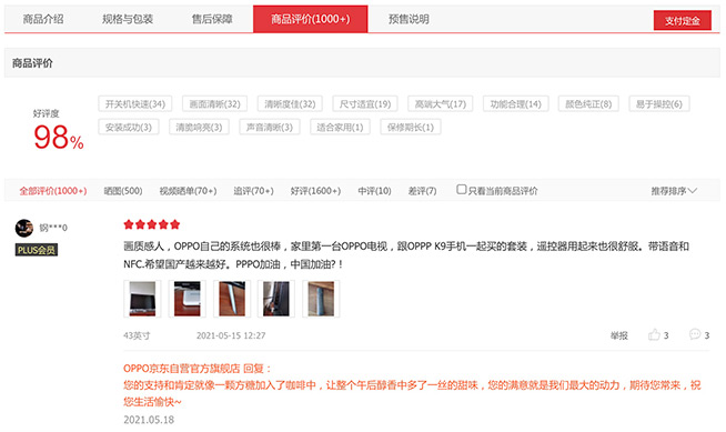 上市幾天時(shí)間,OPPO智能電視K9首批用戶的點(diǎn)評(píng)已經(jīng)陸續(xù)上線。截稿時(shí)該機(jī)在京東的好評(píng)率高達(dá)98%,口碑之高也從側(cè)面驗(yàn)證了產(chǎn)品的用心。開關(guān)機(jī)快速、畫面清晰、清晰度佳,是目前用戶評(píng)價(jià)標(biāo)簽的TOP 3,翻看評(píng)價(jià)后發(fā)現(xiàn),認(rèn)可OPPO智能電視K9電視性價(jià)比高、良心價(jià)格的消費(fèi)者也不在少數(shù)。