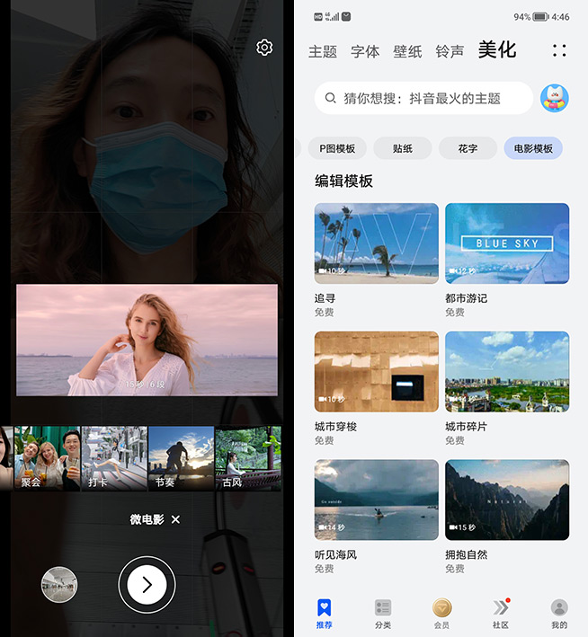 邊學(xué)邊用,很多時候會事半功倍。有鑒于此,榮耀50內(nèi)置了微電影模板,若用戶想拍Vlog又一時間缺乏靈感的話,不妨通過跟拍學(xué)習(xí)的方式拍攝素材,只需簡單幾步就能創(chuàng)作出畫風(fēng)專業(yè)且配音帶感的Vlog,好玩又能出好片。如果這些模板都玩膩了,還可以在主題中心下載更多。