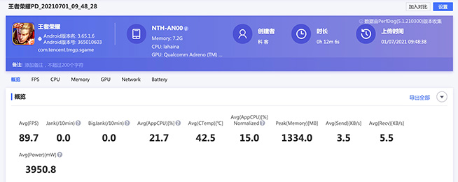 接下來進入5V5王者峽谷匹配賽,在游戲?qū)Q全程,榮耀50流暢無卡頓,機身發(fā)熱不明顯,觸控跟手靈敏度令人滿意。根據(jù)PerfDog監(jiān)測的數(shù)據(jù),榮耀50在近12分鐘的游戲中,平均幀率高達89.7FPS,表明確實能夠持續(xù)高幀率運行,而CPU平均溫度42.5℃,說明溫度控制也表現(xiàn)不俗。?