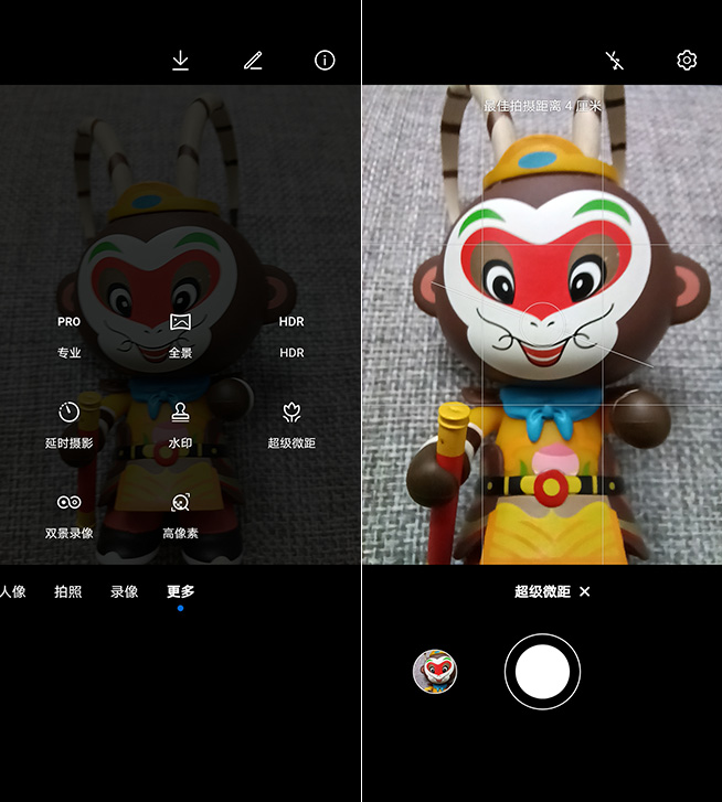 如果需要拍攝更近的物品,可在相機的更多菜單下選擇超級微距,此時將調(diào)用專門的微距鏡頭進行拍攝。