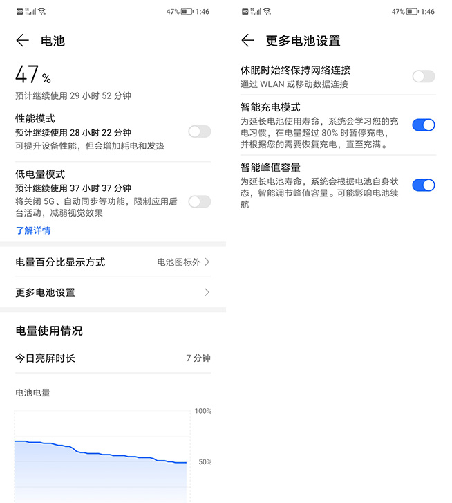 內(nèi)置4000mAh的榮耀X20 SE,實測在插卡連接WiFi的狀態(tài)下,夜間8小時熄屏待機掉電5%。而在充滿電后玩游戲、刷短視頻各半小時、社交聊天刷資訊2小時之后,電量還剩55%,按照這樣的能耗來算,日常續(xù)航超過1天不成問題。
