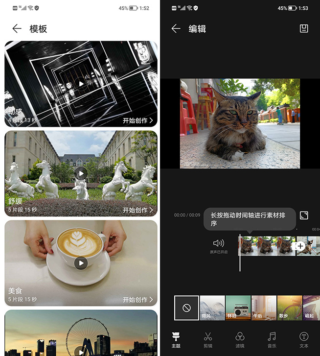 榮耀X20 SE的圖庫功能不僅可方便用戶隨時欣賞手機拍出的照片和視頻素材,在此還能對相關(guān)素材進行方便的后期處理。使用微電影創(chuàng)作,簡單選擇視頻片段即可通過模板快速生成聲畫俱佳的微電影。