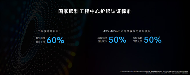 此外,榮耀MagicBook 14/15銳龍版的護(hù)眼模式還通過(guò)了國(guó)家眼科工程中心的護(hù)眼專業(yè)測(cè)試,在開(kāi)啟護(hù)眼后可有效減少有害藍(lán)光輻射。以榮耀MagicBook 15銳龍版為例,經(jīng)過(guò)國(guó)家眼科工程中心的測(cè)試,在電腦開(kāi)啟護(hù)眼模式后,藍(lán)光峰值最高下降60%,435~465nm光毒性較強(qiáng)的藍(lán)光波段成分積分占比減少50%。此外,榮耀MagicBook護(hù)眼模式還能通過(guò)調(diào)整屏幕亮度和顯示色溫,預(yù)防視疲勞,提高眼部舒適度,為年輕人帶來(lái)更安心的護(hù)眼保障。