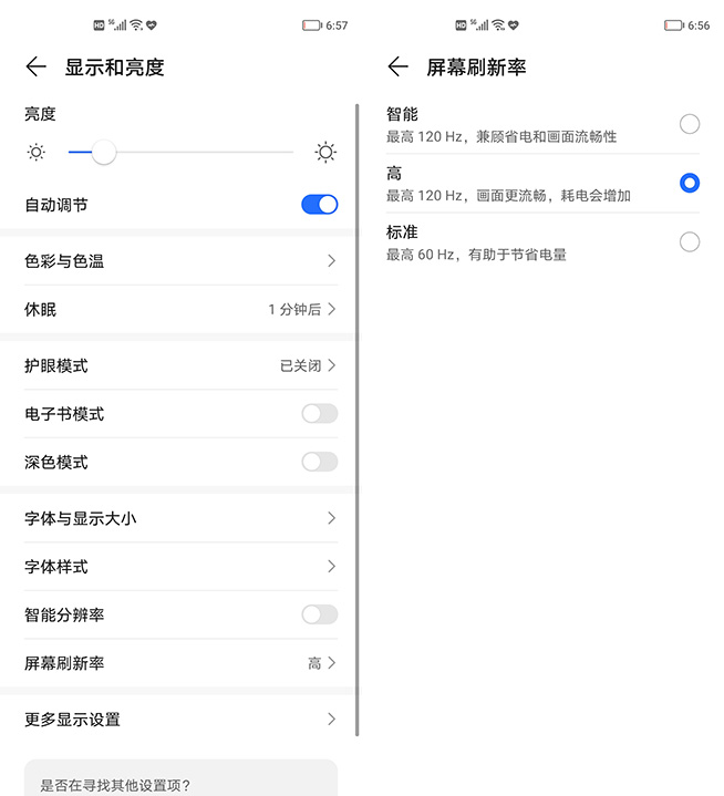 應(yīng)消費者和粉絲的需求,榮耀X20升級至120Hz高刷屏,這是榮耀X系列的首款高刷機型。在顯示設(shè)置中,除了標準的60Hz以及火力全開的120Hz之外,還提供了智能檔,啟用之后系統(tǒng)會根據(jù)不同使用場景,動態(tài)調(diào)整屏幕刷新率。也就是說,在能夠以及更有必要啟用120Hz的時候可自動匹配,而不支持或者非必要的場景下,則相應(yīng)降低刷新率,避免過度耗電,繼而兼顧省電與畫面流暢度的平衡。