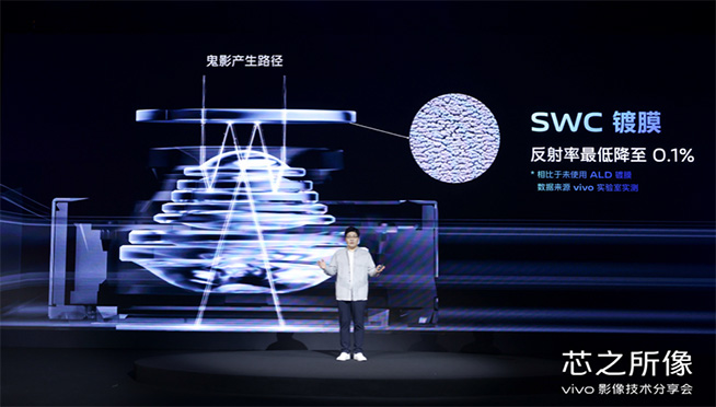 面對炫光和鬼影等行業(yè)傳統(tǒng)難題,vivo創(chuàng)新引入SWC鍍膜技術(shù)。基于仿生學(xué)原理,充分抑制反射光,反射率最低降低至0.1%,大幅提升純凈度。此外,vivo獨(dú)家首發(fā)ALD原子層沉積工藝,在超高透玻璃鏡片上形成納米級鍍膜,進(jìn)一步降低光線反射。