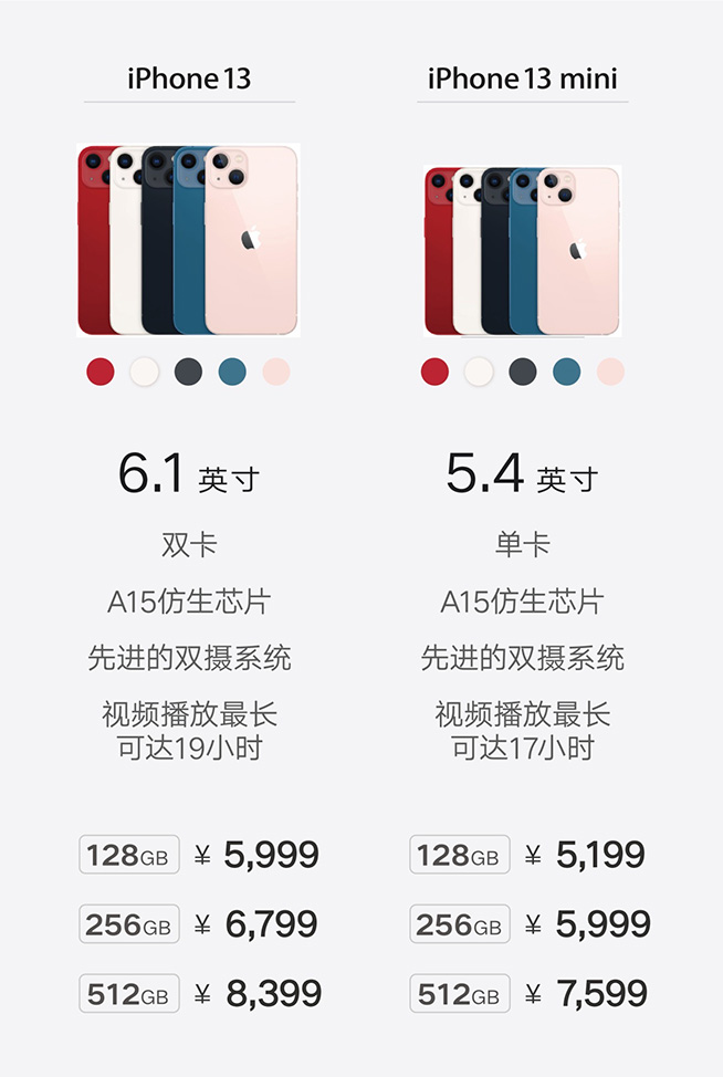 本次蘋果公司發(fā)布iPhone 13系列四款手機(jī),分別是iPhone 13和iPhone 13 mini,iPhone 13 Pro和iPhone 13 Pro Max。在標(biāo)準(zhǔn)版機(jī)型方面,iPhone 13屏幕上方的“劉海”縮小了20%。芯片采用了蘋果自研的A15芯片,A15基于5nm工藝、共有6個(gè)CPU內(nèi)核,性能領(lǐng)先優(yōu)勢最高40%。在5G通信能力方面,iPhone 13定制了天線和無線電組件,可以支持更多的5G頻段,更適配聯(lián)通5G網(wǎng)絡(luò)。這次蘋果特別提到了iPhone 13的續(xù)航能力,相比上代續(xù)航時(shí)間提升了2.5小時(shí)。