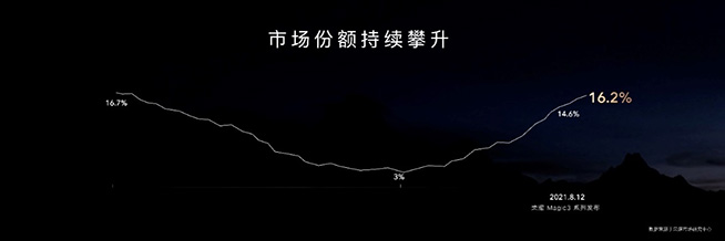 憑借全能科技實力強勢賦能,榮耀Magic3系列展現(xiàn)了強大的產(chǎn)品勢能。榮耀Magic3系列自上市以來在4K-8K價位段累計銷量第三,助力榮耀全面進入銷售上量的快速發(fā)展階段。伴隨榮耀Magic3系列的火爆熱銷和強勢助攻,榮耀市場份額已回升至16.2%,完成了一個史無前例的V字反轉,距離榮耀歷史的最高水平僅一步之遙!