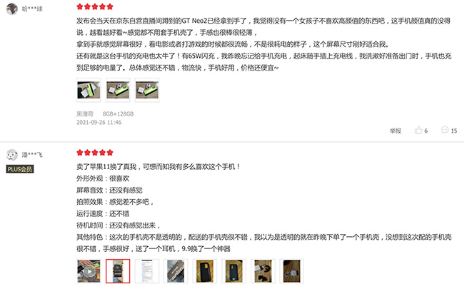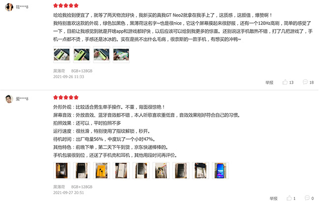 對于產(chǎn)品的性能和續(xù)航表現(xiàn),有用戶表示“開啥app和游戲都好快”、“打了幾把游戲了,手機一點都不燙”、“重度使用一天完全沒有問題”、“用它玩了一下午游戲,真的非常流暢”。一段段褒獎,讓人隔著屏幕也能感受到真我GT Neo2的優(yōu)秀。截稿時為止,真我GT Neo2在京東收獲了高達96%的好評。?