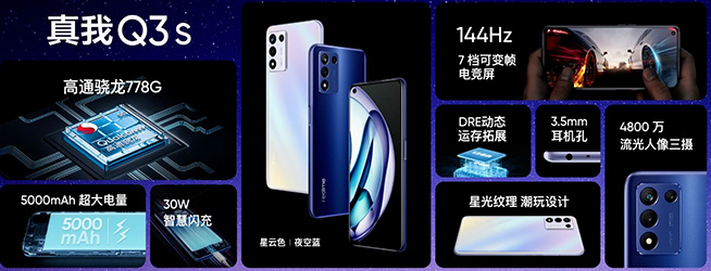 真我Q3s擁有夜光藍(lán)和星云色,搭載高通驍龍778G芯片,相較于上代擁有40%的CPU和GPU提升。內(nèi)置5000mAh的真我Q3s保留3.5mm耳機(jī)接口的同時(shí),厚度進(jìn)一步縮減,只有8.5mm,在30W智慧閃充的加持下,25分鐘可充至50%。