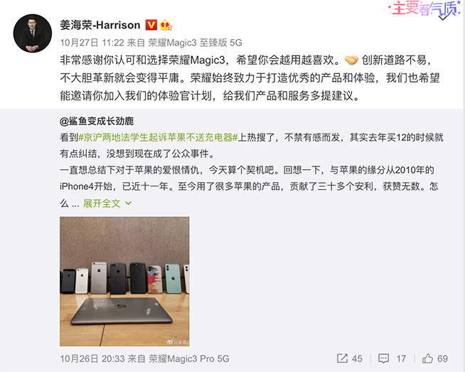 放在以前,撬動(dòng)蘋果用戶可能被認(rèn)為是妄想,但隨著以榮耀Magic3系列為代表的國(guó)產(chǎn)手機(jī)勢(shì)頭崛起,從蘋果口中奪食不是不可能。要知道近幾年蘋果產(chǎn)品缺乏創(chuàng)新,用戶數(shù)量逐年下降已成為事實(shí)。僅2020年上半年,就有約46%的iOS用戶在換機(jī)時(shí)選擇投入安卓陣營(yíng),這一數(shù)字比過去同期增加了2.8%。不僅如此,近期京滬兩地5名法學(xué)生起訴蘋果不送充電器還沖上了微博熱搜,一時(shí)間蘋果又成了大眾口誅筆伐的對(duì)象。無(wú)獨(dú)有偶,一位11年資深果粉發(fā)布長(zhǎng)文告別蘋果,吐槽iPhone近年來(lái)擠牙膏式創(chuàng)新更是引發(fā)網(wǎng)友關(guān)注,還有不少人站臺(tái)國(guó)產(chǎn)品牌。