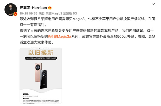 2021年是一個(gè)重要的時(shí)間節(jié)點(diǎn),今年雙11也是榮耀排兵布陣的重要戰(zhàn)場(chǎng)。榮耀高管姜海榮公布榮耀雙11補(bǔ)貼政策,即榮耀老用戶和蘋(píng)果用戶都可以參與以舊換新購(gòu)榮耀Magic3系列活動(dòng),同時(shí)享受最高500元的額外補(bǔ)貼。通過(guò)此舉,一方面顯示出榮耀對(duì)標(biāo)蘋(píng)果的戰(zhàn)略布局,另一方面也足以看出榮耀對(duì)自家產(chǎn)品的強(qiáng)大自信心。