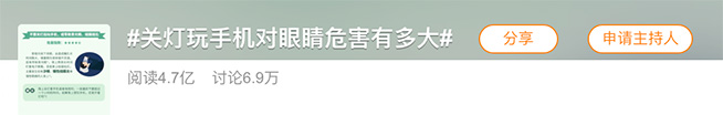 眼睛容易干澀或疲勞、視力變差,不少朋友都有類似煩惱,相信也有許多人意識到是玩手機惹的禍,然而危害到底有多大,恐怕大都是一知半解。11月9日,人民日報社主辦的《健康時報》發(fā)布相關(guān)調(diào)研報告,直觀的數(shù)據(jù)觸目驚心,#關(guān)燈玩手機對眼睛危害有多大#的微博話題沖上熱搜第一,并在短短幾天吸引了接近7萬討論,閱讀4.7億,引發(fā)廣泛關(guān)注。