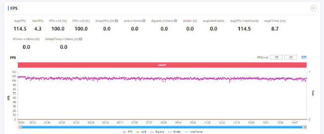 榮耀60 Pro支持王者榮耀120Hz的高幀率模式,以往能夠支持120Hz模式的通常都為8系手機,所以我們重點測試了王者榮耀120Hz模式,整體感覺還是非常穩(wěn)定的,而且由軟件同步監(jiān)測的游戲數(shù)據(jù)可知,榮耀60 Pro跑出了一條整體上近乎拉直的幀率線,平均幀率高達119FPS,表明運行相當平穩(wěn),高性能得到持續(xù)穩(wěn)定釋放。平時有關(guān)注手機游戲性能的朋友應該了解,119FPS的平均幀率意味著玩游戲頗為流暢,榮耀60系列的成績甚至媲美今年一眾搭載驍龍8系旗艦芯片的產(chǎn)品。