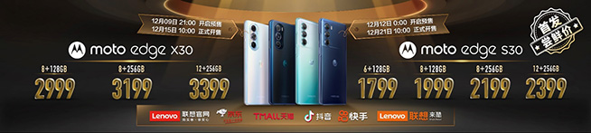 moto edge X30與moto edge S30將于聯(lián)想官網(wǎng)、京東、天貓、抖音、快手、來(lái)酷平臺(tái)開(kāi)啟預(yù)售、正式開(kāi)售。moto edge X30 8+128GB版本售價(jià)3199元,首發(fā)嘗鮮價(jià)2999元;8+256GB版本售價(jià)3399元,首發(fā)嘗鮮價(jià)3199元;12+256GB版本售價(jià)3599元,首發(fā)嘗鮮價(jià)3399元。12月9日21時(shí)開(kāi)啟預(yù)售,12月15日10時(shí)正式開(kāi)售。