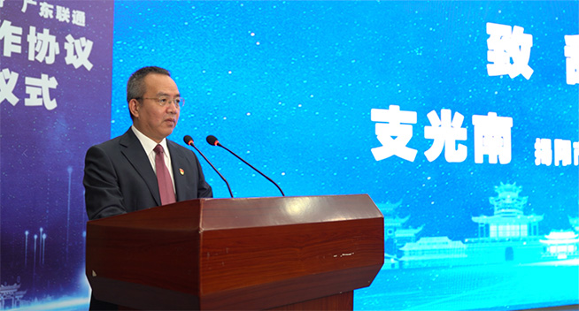儀式上,支光南代表揭陽(yáng)市人民政府發(fā)表致辭,他表示,廣東聯(lián)通是通信服務(wù)龍頭,是信息時(shí)代、智慧城市、數(shù)字經(jīng)濟(jì)建設(shè)的主力軍,希望廣東聯(lián)通充分發(fā)揮基礎(chǔ)網(wǎng)絡(luò)、行業(yè)資源和技術(shù)優(yōu)勢(shì),深度參與揭陽(yáng)經(jīng)濟(jì)社會(huì)發(fā)展,以信息化培育新功能,用新動(dòng)能推動(dòng)新發(fā)展,努力為企業(yè)和群眾提供更加高效、穩(wěn)定和方便的信息化創(chuàng)新產(chǎn)品和優(yōu)質(zhì)服務(wù),以信息化推動(dòng)高質(zhì)量發(fā)展,創(chuàng)造高品質(zhì)生活,全方位建設(shè)智慧揭陽(yáng)。