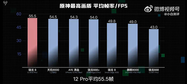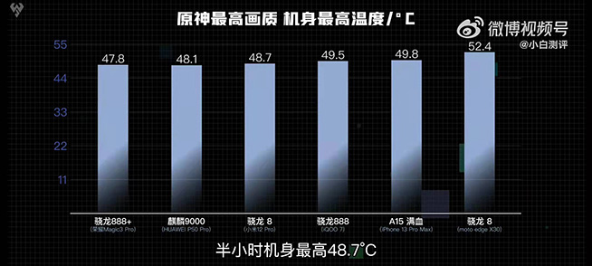 在小米12系列的發(fā)布會上,小米12 Pro半小時玩原神的官方成績?yōu)槠骄鶐?7FPS、限溫最高48°C。而小白測評的數(shù)據(jù)則顯示,小米12 Pro跑原神半小時的平均幀率為55.5FPS,機身最高溫度48.7°C。統(tǒng)一參考第三方的測試數(shù)據(jù)來看,目前驍龍8在高性能的持久釋放方面相比驍龍888 Plus有小幅度優(yōu)勢,體現(xiàn)在跑原神的平均幀率能達到更高。不過溫度控制則依然還是驍龍888 Plus更優(yōu)一些,此消彼長,驍龍888+與驍龍8的游戲體驗似乎并未拉開明顯差距。