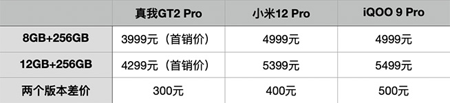 說(shuō)到價(jià)格的話題,順便對(duì)比一下近期推出的三款驍龍8機(jī)型8GB+256GB與12GB+256GB的價(jià)格差異,這兩種配置應(yīng)該是目前較多消費(fèi)者會(huì)考慮的版本。不比不知道,看完下面的對(duì)比表格才發(fā)現(xiàn),同樣是256GB的容量,12GB內(nèi)存的iQOO 9 Pro相比8GB貴了足足500元,而真我GT2 Pro與小米12 Pro的價(jià)差分別是300元和400元。不知各位對(duì)此有何感想?