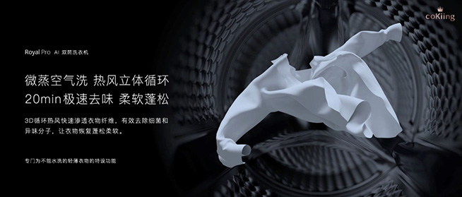 針對部分高端衣物不能?洗的需求,Royal Pro coKiing高端AI雙筒洗衣機還特設(shè)微蒸空?洗的功能,3D循環(huán)熱?快速滲透?物纖維,20min極速去味,讓?物恢復蓬松柔軟。