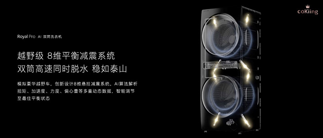 除了高端分區(qū)洗護外,Royal Pro coKiing高端AI雙筒洗衣機還配有越野級創(chuàng)新設(shè)計8維平衡減震系統(tǒng),雙筒高速同時脫水,穩(wěn)如泰?。同時,上下雙筒都配備雙DD進口變頻直驅(qū)電機,磁懸浮高速驅(qū)動,運行平穩(wěn),超低噪音,保證家居環(huán)境的安靜舒適。