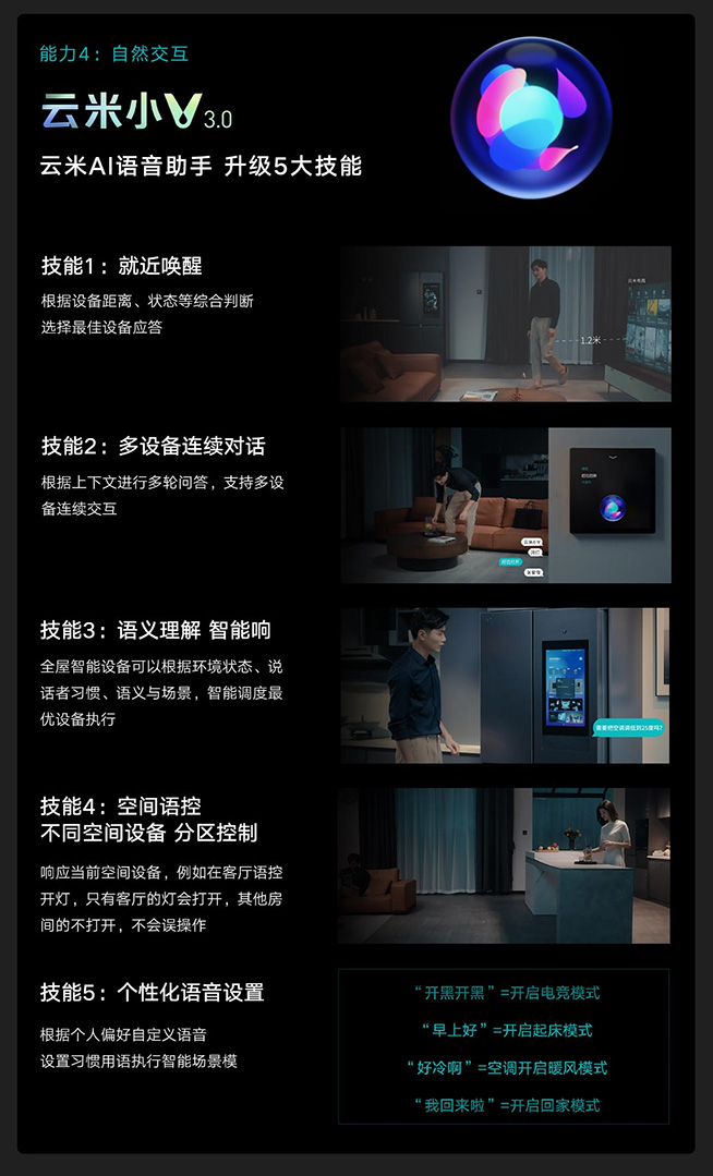 云米小V 3.0全新升級,讓自然交互成為可能。云米小V 3.0能根據(jù)設(shè)備距離、狀態(tài)等綜合判斷選擇最佳設(shè)備應答,避免多設(shè)備同時響應的混亂體驗,還可以根據(jù)上下?進?多輪問答,?持多設(shè)備連續(xù)交互,?需重復喚醒。云米小V 3.0還實現(xiàn)了空間語控,讓分區(qū)控制成為現(xiàn)實。此外,用戶還能根據(jù)個?偏好?定義語?,設(shè)置習慣?語執(zhí)?智能場景模式。云??V 3.0,讓用戶想怎么說就怎么說!