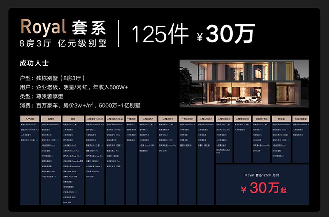 發(fā)布會上,云米還推出多套智能套系,以更好滿足不同家庭的個性化需求。其中,專為億元級別墅用戶打造,多達125件AI產(chǎn)品在內(nèi)的Royal套系,更是以30萬元起售的價格,突破了國內(nèi)全屋智能家居市場的“天花板”,充分體現(xiàn)了云米搶占高端市場的決心與信心。