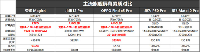 在其它屏幕規(guī)格方面,由上面多款旗艦機(jī)的參數(shù)對比可知,榮耀Magic4標(biāo)準(zhǔn)版諸如真10.7億色、曲面屏也都安排上了,而部分消費(fèi)者較為在意的分辨率與PPI像素密度,OPPO Find X5 Pro與小米12 Pro則更高一些。