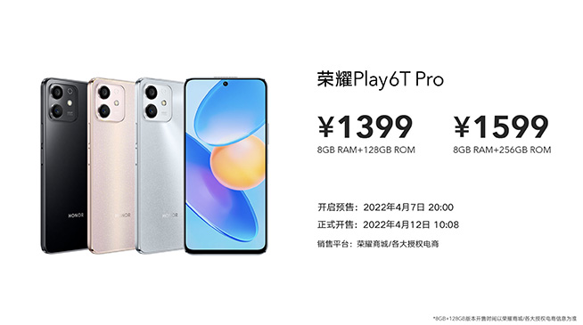 榮耀Play6T提供幻夜黑、魅海藍(lán)、鈦空銀三種配色,榮耀Play6T 8+128GB版本售價(jià)1199元,8+256GB版本售價(jià)1399元,于4月7日20:00開(kāi)啟預(yù)售,4月15日10:08正式開(kāi)售!歡迎大家前往榮耀商城及各大授權(quán)電商平臺(tái)了解購(gòu)買(mǎi)今天的兩款新品!