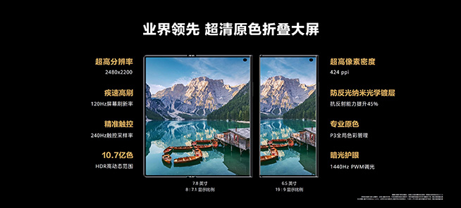 在折疊屏展開之后,華為Mate Xs 2提供7.8英寸的大視野,分辨率為8:7.1的2480*2200像素,而折疊屏合上之后,6.5英寸的屏幕分辨率為19:9的2480*1176像素,與主流手機的顯示比例不相上下,用戶可以輕松使用。無論折疊屏合上還是展開,華為Mate Xs 2均有120Hz的高刷新率以及424 ppi的高精細度,加上有1440Hz PWM高頻調(diào)光,賞心悅目的同時也兼顧了護眼的能力。
