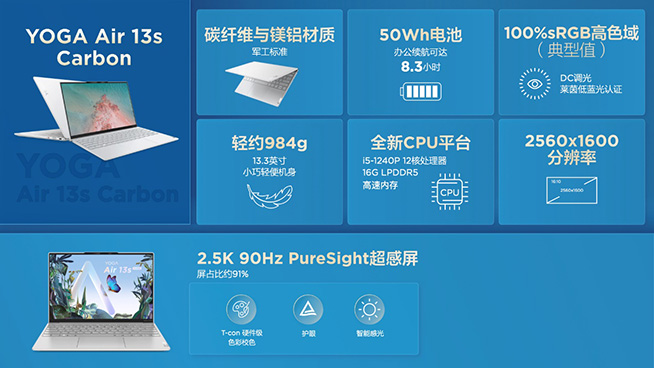 “輕盈本”YOGA Air 13s Carbon外觀如珠似寶,輕盈優(yōu)雅,機身采用碳纖維和鋁鎂等高端材質,輕約984克,十分小巧。搭載最新第十二代酷睿處理器,配備2.5K 90Hz PURESIGHT超感屏,續(xù)航長達8.3小時,身量輕盈卻性能強大。