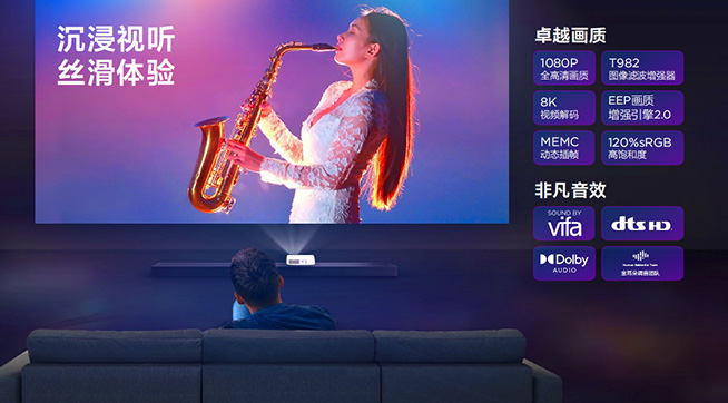 小新520智能投影儀不僅顏值優(yōu)越,實力同樣不凡。畫質上,支持8K解碼,120%sRGB廣色域及獨創(chuàng)EEP畫質引擎2.0,保證時刻投出高清畫質。音頻上,小新520智能投影儀與丹麥Vifa音響品牌深度合作,同時還通過了杜比音效和DTS雙認證,以及DSP動態(tài)聲學算法加持,精準還原每一個音階。再搭配上兩支5W的全頻立體揚聲器和300CC的大體積音腔,帶來高保真的天籟音質體驗。